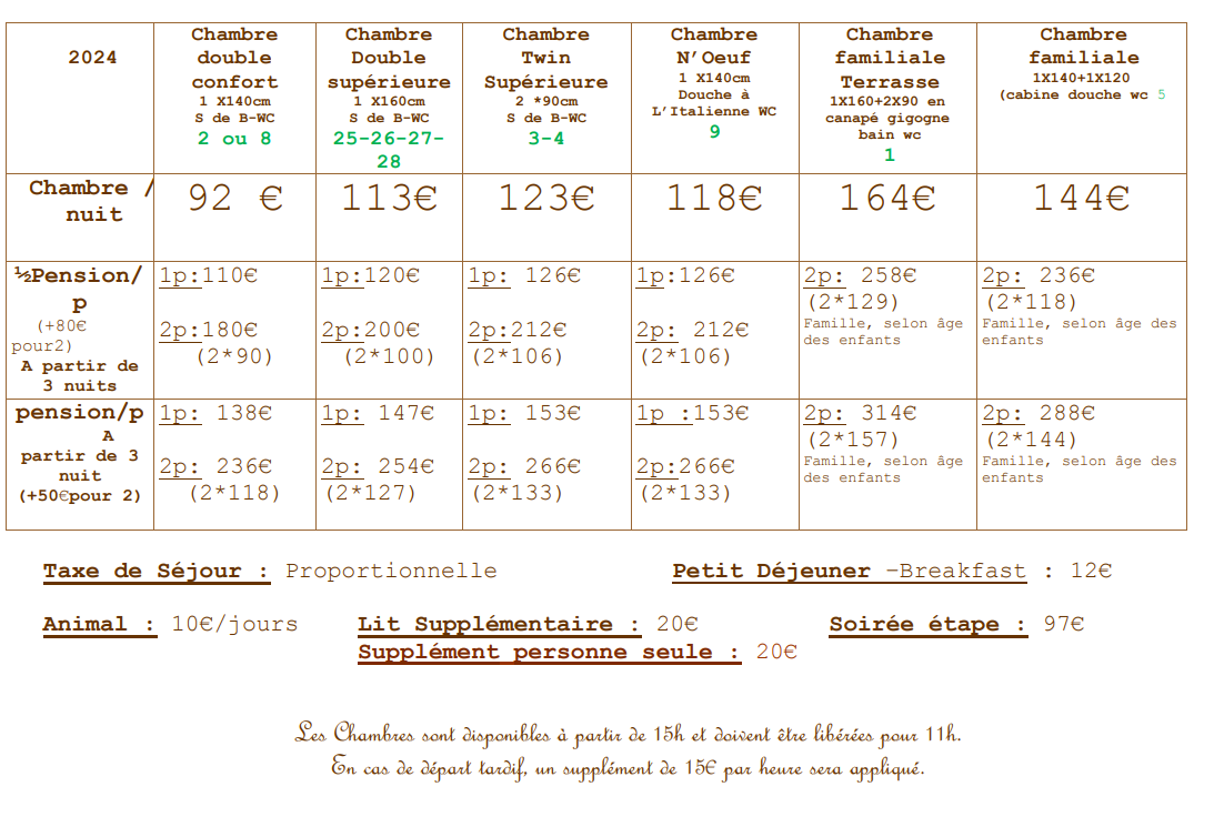Les Tarifs de l'Auberge Campagnarde à Evosges